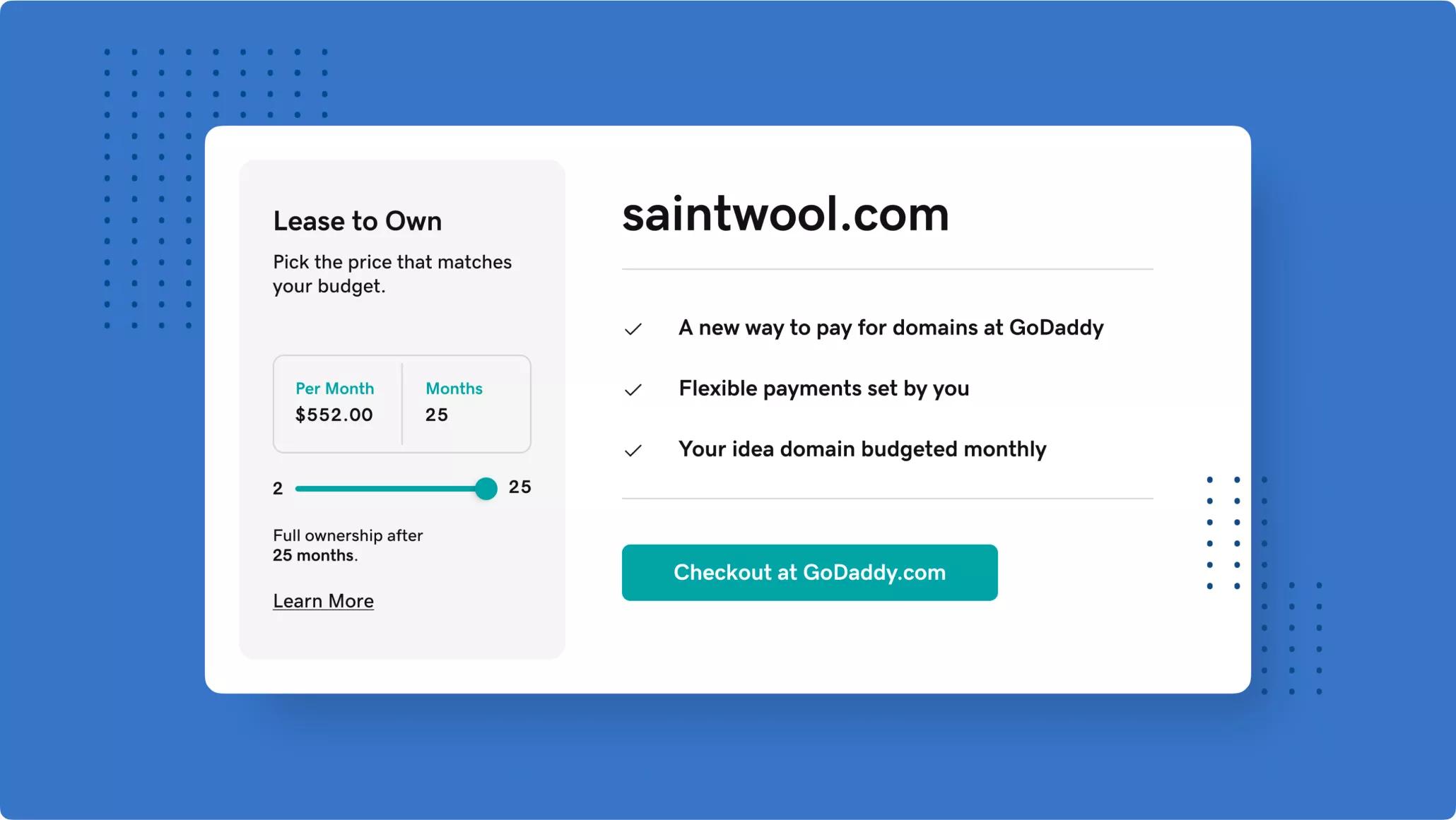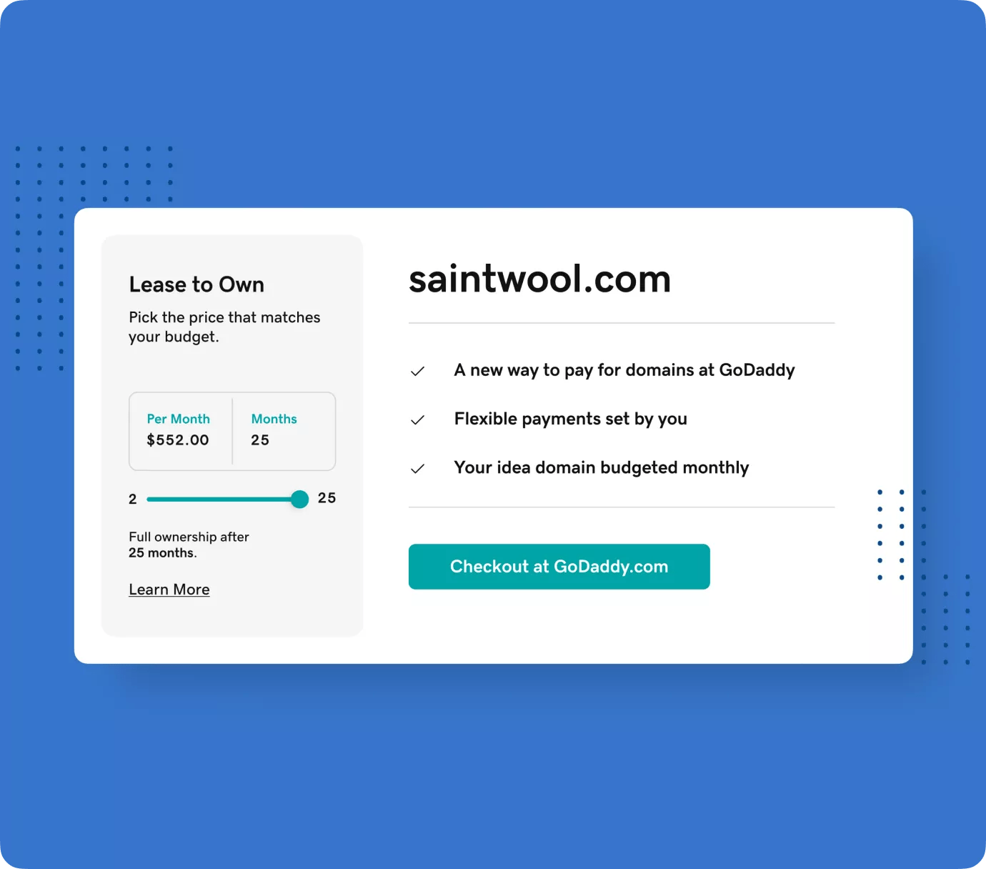 Lease to Own provides buyers with the option to pay for a domain using monthly payments over a set term, rather than purchasing a domain for an up-front fee. This additional payment option helps make domains more affordable and gives sellers the benefit of reaching a larger pool of potential buyers.